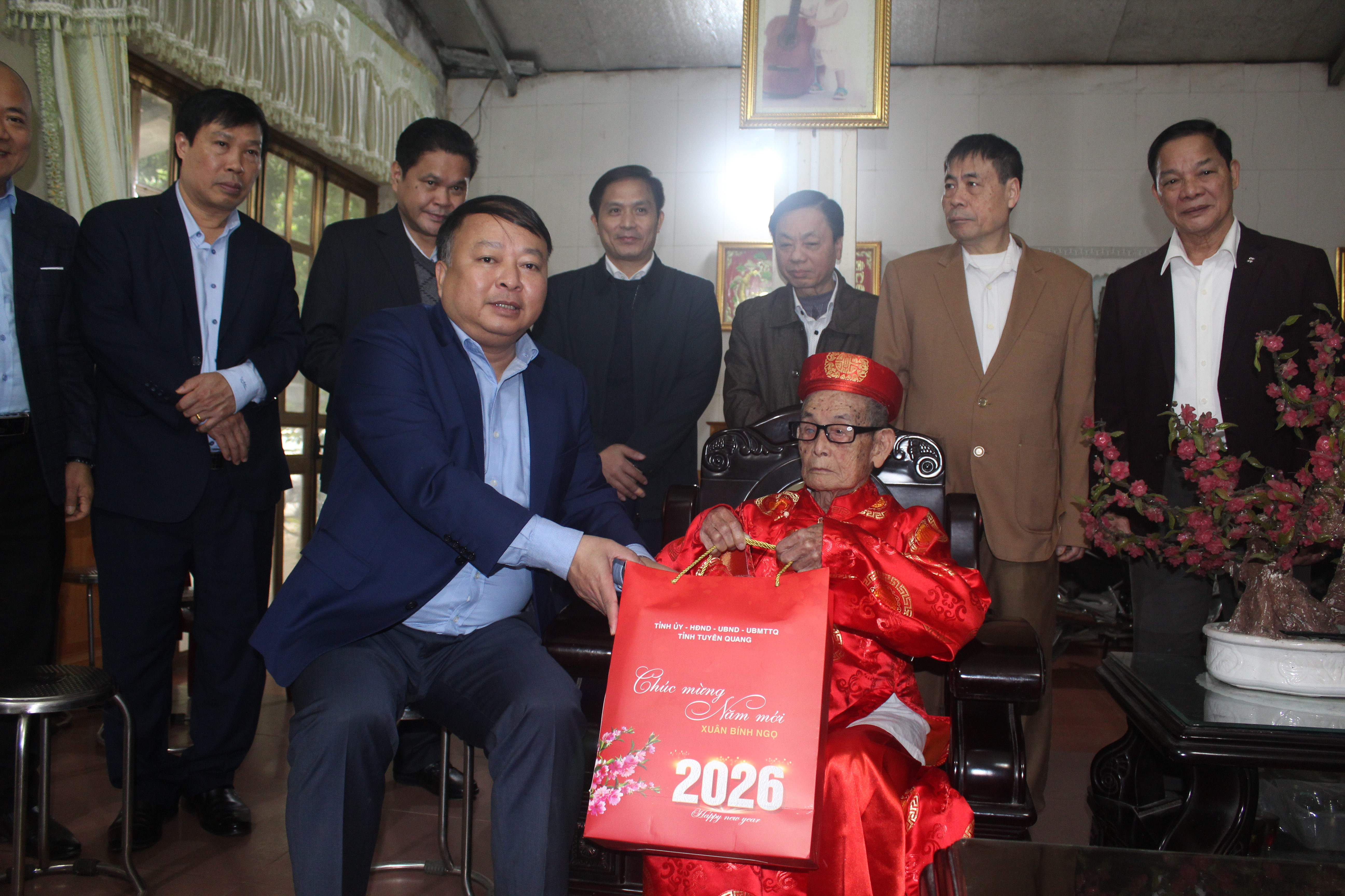 Đến thăm gia đình cụ: Trần Văn Bang, Tổ 17, Trần Phú năm nay 105 tuổi và cụ Ma Trọng Tư, tổ 7, Minh Khai, 101 tuổi, là cán bộ tiền khởi nghĩa với 77 năm tuổi Đảng. Chủ tịch UBND tỉnh Phan Huy Ngọc đã ân cần hỏi thăm tỉnh hình sức khỏe, sinh hoạt hằng ngày của hai cụ. Chủ tịch UBND tỉnh vui mừng khi thấy hai cụ còn khỏe mạnh, minh mẫn. Nhân dịp năm mới và chào Xuân Bính Ngọ 2026, Chủ tịch UBND tỉnh chúc hai cụ luôn luôn mạnh khỏe, tiếp tục là chỗ dự tinh thần cho con, cháu, chắt trong gia đình; thường xuyên động viên con, cháu, chắt phát huy truyền thống gia đình cách mạng để học tập, làm việc, công tác và cống hiến để xây dựng quê hương ngày càng giàu đẹp.