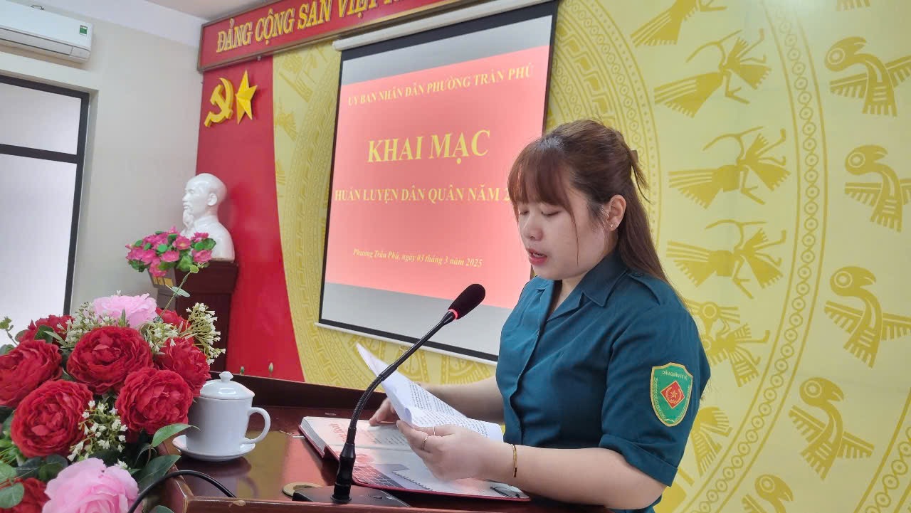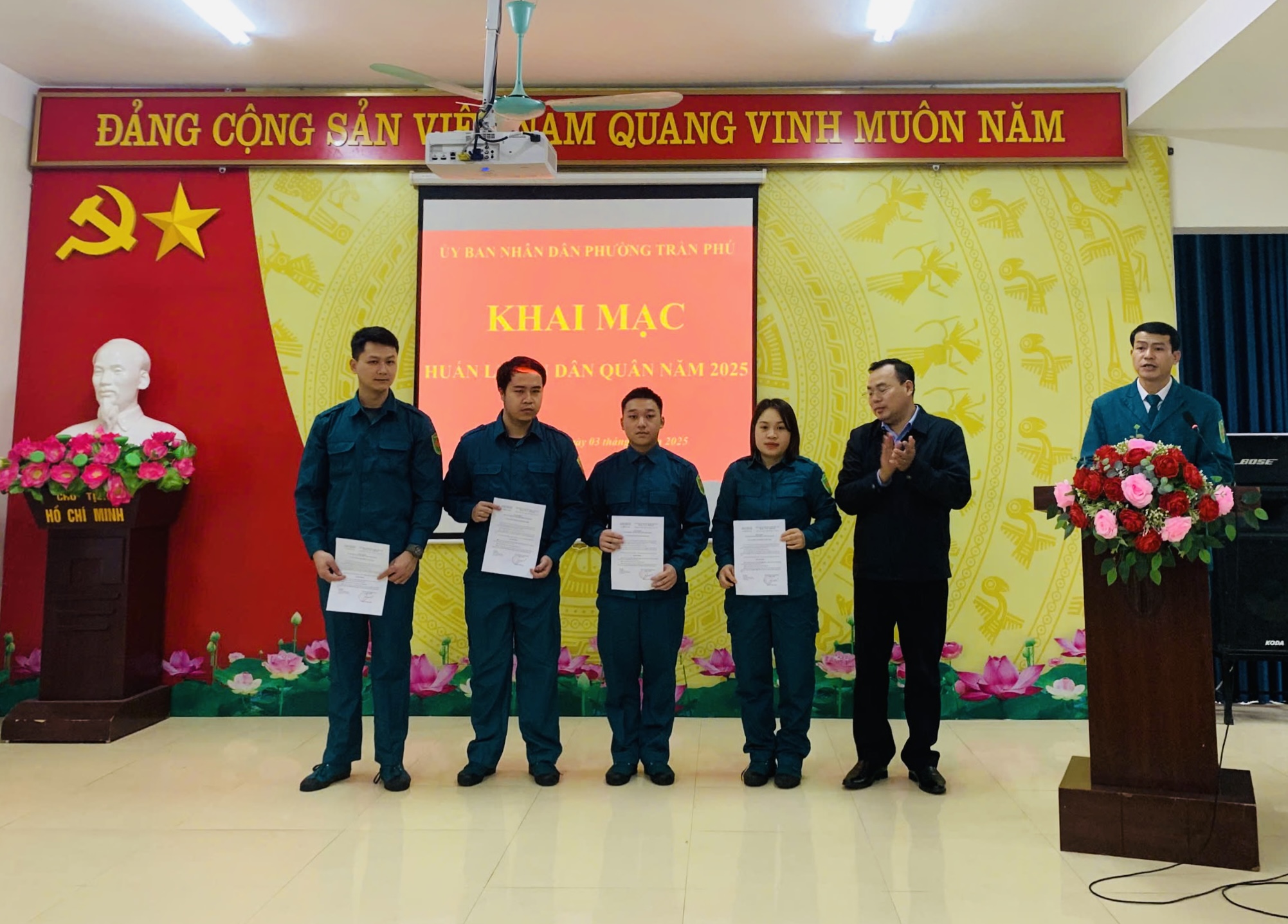 Sáng ngày 03/3/2025, UBND phường Trần Phú tổ chức khai mạc huấn luyện dân quân năm 2025, dự khai mạc có đ/c Phùng Văn Tiến - UV BCH thành ủy, Bí thư Đảng uỷ, đ/c Nguyễn Tiến Linh - Chủ tịch UBND, đ/c Trương Mạnh Hiền - thượng tá phó chỉ huy trưởng Ban CHQS thành phố, lãnh đạo MTTQ, các tổ chức CTXH, lãnh đạo Công an, trạm y tế, bí thư tổ trưởng 17 tổ trưởng tổ dân phố, phóng viên Trung tâm VHTT&DL thành phố và 68 đ/c Dân quân phường.